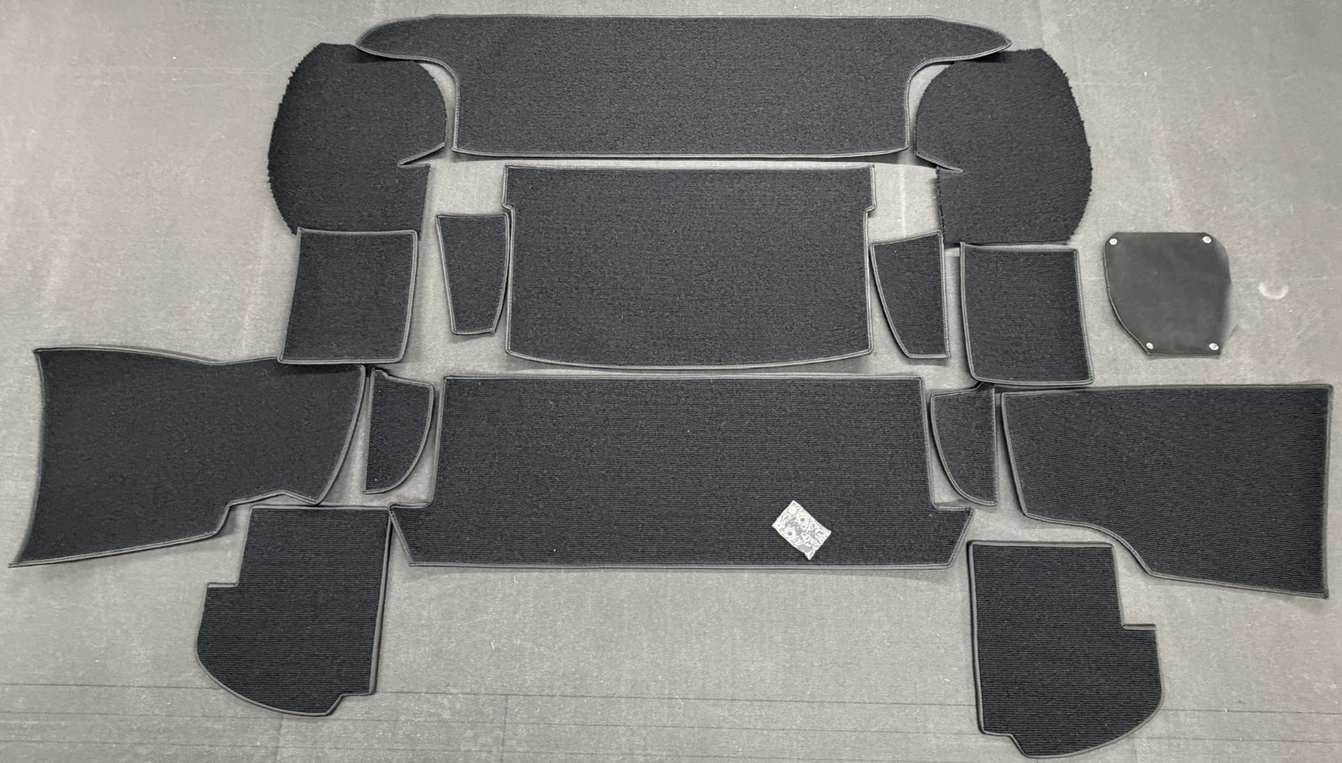 This is a Ferrari 308 full boot package. Made from Black loop pile carpet as original with the correct vinyl edge binding. The set comes with all the lower boot carpets consisting of 13 carpet pieces, two carpet covered boards to cover the rear light area, the vinyl trim cover for the electric aerial and the two sets of studs to hold down the lower mat.